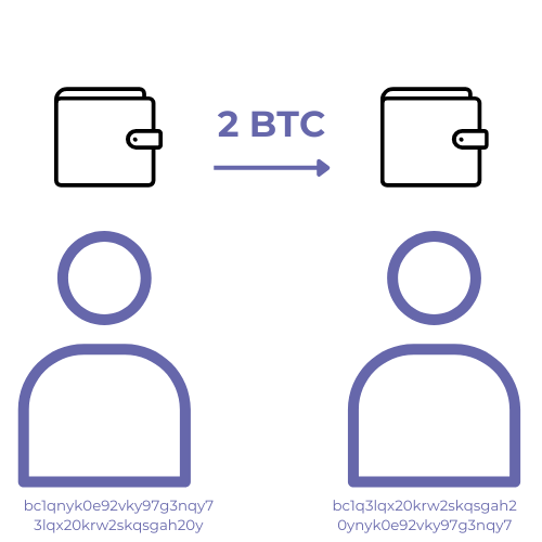 Par exemple Selma souhaite envoyer 2 BTC Ă Issam, pour ce faire, elle a envoyĂ© depuis lâadresse de son portefeuille Ă©lectronique (wallet) 2 BTC vers lâadresse du portefeuille dâIssam, lâadresse dâun portefeuille câest comme un RIB, une suite de chiffres et de lettres, on parle donc de pseudonyme sur le rĂ©seau Bitcoin car les adresses ne rĂ©vĂšlent pas lâidentitĂ© des utilisateurs.