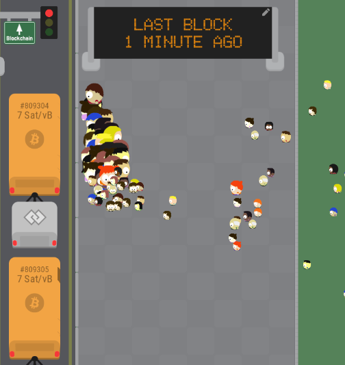 Un exemple de visualisation ludique des transactions en attente de validation dans les blocs.